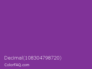 Decimal 108304798720 Color is a normal purple color and the nearest color is Vivid Violet #803790. Hex code #803298 and RGB value is rgb(128,50,152). In RGB color space, this color is composed of 50% red, 20% green, 60% blue, In CMYK color space, this color is composed of 16% cyan, 67% magenta, 0% yellow , 40% black , In HSL color space, this color has a hue angle of 286° , 50% saturation and 40% lightness.