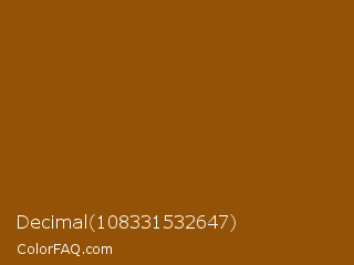 Decimal 108331532647 Color is a dark orange color and the nearest color is Brown #964b00. Hex code #945207 and RGB value is rgb(148,82,7). In RGB color space, this color is composed of 58% red, 32% green, 3% blue, In CMYK color space, this color is composed of 0% cyan, 45% magenta, 95% yellow , 42% black , In HSL color space, this color has a hue angle of 32° , 91% saturation and 30% lightness.
