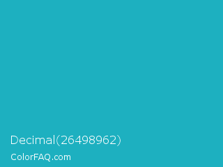 Decimal 26498962 Color is a normal cyan color and the nearest color is Pacific Blue #1ca9c9. Hex code #1db0c0 and RGB value is rgb(29,176,192). In RGB color space, this color is composed of 11% red, 69% green, 75% blue, In CMYK color space, this color is composed of 85% cyan, 8% magenta, 0% yellow , 25% black , In HSL color space, this color has a hue angle of 186° , 74% saturation and 43% lightness.