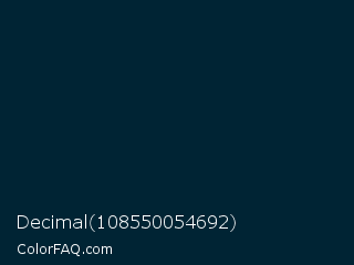Decimal 108550054692 Color is a very dark blue color and the nearest color is Daintree #012731. Hex code #002434 and RGB value is rgb(0,36,52). In RGB color space, this color is composed of 0% red, 14% green, 20% blue, In CMYK color space, this color is composed of 100% cyan, 31% magenta, 0% yellow , 80% black , In HSL color space, this color has a hue angle of 198° , 100% saturation and 10% lightness.