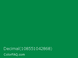 Decimal 108551042868 Color is a dark green color and the nearest color is Spanish Green #009150. Hex code #018946 and RGB value is rgb(1,137,70). In RGB color space, this color is composed of 0% red, 54% green, 27% blue, In CMYK color space, this color is composed of 99% cyan, 0% magenta, 49% yellow , 46% black , In HSL color space, this color has a hue angle of 150° , 99% saturation and 27% lightness.