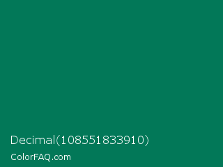 Decimal 108551833910 Color is a dark cyan color and the nearest color is Tropical Rain Forest #00755e. Hex code #027858 and RGB value is rgb(2,120,88). In RGB color space, this color is composed of 1% red, 47% green, 35% blue, In CMYK color space, this color is composed of 98% cyan, 0% magenta, 27% yellow , 53% black , In HSL color space, this color has a hue angle of 164° , 97% saturation and 24% lightness.