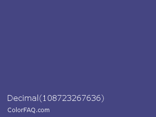 Decimal 108723267636 Color is a normal blue color and the nearest color is East Bay #414c7d. Hex code #454582 and RGB value is rgb(69,69,130). In RGB color space, this color is composed of 27% red, 27% green, 51% blue, In CMYK color space, this color is composed of 47% cyan, 47% magenta, 0% yellow , 49% black , In HSL color space, this color has a hue angle of 240° , 31% saturation and 39% lightness.