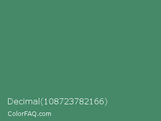 Decimal 108723782166 Color is a normal green color and the nearest color is Viridian #40826d. Hex code #458968 and RGB value is rgb(69,137,104). In RGB color space, this color is composed of 27% red, 54% green, 41% blue, In CMYK color space, this color is composed of 50% cyan, 0% magenta, 24% yellow , 46% black , In HSL color space, this color has a hue angle of 151° , 33% saturation and 40% lightness.