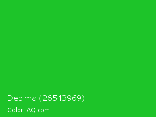 Decimal 26543969 Color is a normal green color and the nearest color is Lime Green #32cd32. Hex code #1dc429 and RGB value is rgb(29,196,41). In RGB color space, this color is composed of 11% red, 77% green, 16% blue, In CMYK color space, this color is composed of 85% cyan, 0% magenta, 79% yellow , 23% black , In HSL color space, this color has a hue angle of 124° , 74% saturation and 44% lightness.