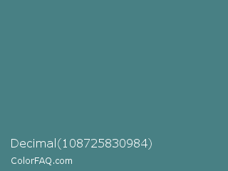 Decimal 108725830984 Color is a normal cyan color and the nearest color is Smalt Blue #51808f. Hex code #488084 and RGB value is rgb(72,128,132). In RGB color space, this color is composed of 28% red, 50% green, 52% blue, In CMYK color space, this color is composed of 45% cyan, 3% magenta, 0% yellow , 48% black , In HSL color space, this color has a hue angle of 184° , 29% saturation and 40% lightness.