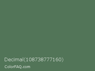 Decimal 108738777160 Color is a normal green color and the nearest color is Cactus #587156. Hex code #527558 and RGB value is rgb(82,117,88). In RGB color space, this color is composed of 32% red, 46% green, 35% blue, In CMYK color space, this color is composed of 30% cyan, 0% magenta, 25% yellow , 54% black , In HSL color space, this color has a hue angle of 130° , 18% saturation and 39% lightness.