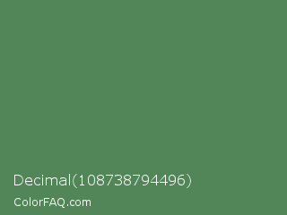 Decimal 108738794496 Color is a normal green color and the nearest color is Middle Green #4d8c57. Hex code #528658 and RGB value is rgb(82,134,88). In RGB color space, this color is composed of 32% red, 53% green, 35% blue, In CMYK color space, this color is composed of 39% cyan, 0% magenta, 34% yellow , 47% black , In HSL color space, this color has a hue angle of 127° , 24% saturation and 42% lightness.