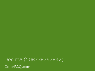 Decimal 108738797842 Color is a normal green color and the nearest color is Vida Loca #549019. Hex code #528920 and RGB value is rgb(82,137,32). In RGB color space, this color is composed of 32% red, 54% green, 13% blue, In CMYK color space, this color is composed of 40% cyan, 0% magenta, 77% yellow , 46% black , In HSL color space, this color has a hue angle of 91° , 62% saturation and 33% lightness.