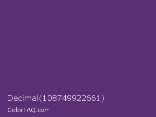 Decimal 108749922661 Color is a normal purple color and the nearest color is Imperial #602f6b. Hex code #593075 and RGB value is rgb(89,48,117). In RGB color space, this color is composed of 35% red, 19% green, 46% blue, In CMYK color space, this color is composed of 24% cyan, 59% magenta, 0% yellow , 54% black , In HSL color space, this color has a hue angle of 276° , 42% saturation and 32% lightness.
