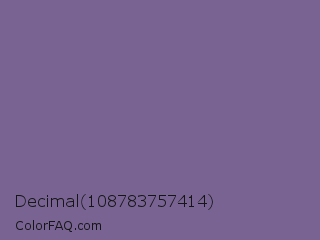 Decimal 108783757414 Color is a normal violet color and the nearest color is Rum #796989. Hex code #786392 and RGB value is rgb(120,99,146). In RGB color space, this color is composed of 47% red, 39% green, 57% blue, In CMYK color space, this color is composed of 18% cyan, 32% magenta, 0% yellow , 43% black , In HSL color space, this color has a hue angle of 267° , 19% saturation and 48% lightness.