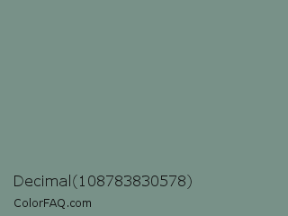 Decimal 108783830578 Color is a normal green color and the nearest color is Dolphin Gray #828e84. Hex code #789188 and RGB value is rgb(120,145,136). In RGB color space, this color is composed of 47% red, 57% green, 53% blue, In CMYK color space, this color is composed of 17% cyan, 0% magenta, 6% yellow , 43% black , In HSL color space, this color has a hue angle of 158° , 10% saturation and 52% lightness.