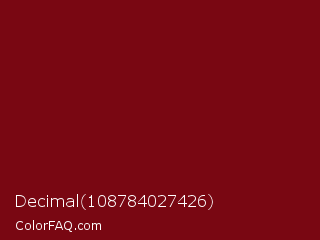 Decimal 108784027426 Color is a dark red color and the nearest color is Venetian Red #72010f. Hex code #790712 and RGB value is rgb(121,7,18). In RGB color space, this color is composed of 47% red, 3% green, 7% blue, In CMYK color space, this color is composed of 0% cyan, 94% magenta, 85% yellow , 53% black , In HSL color space, this color has a hue angle of 354° , 89% saturation and 25% lightness.