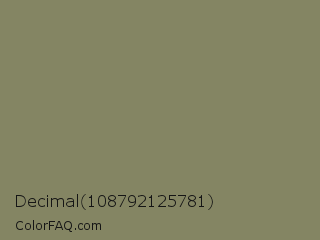 Decimal 108792125781 Color is a normal yellow color and the nearest color is Clay Creek #8a8360. Hex code #848563 and RGB value is rgb(132,133,99). In RGB color space, this color is composed of 52% red, 52% green, 39% blue, In CMYK color space, this color is composed of 1% cyan, 0% magenta, 26% yellow , 48% black , In HSL color space, this color has a hue angle of 62° , 15% saturation and 45% lightness.