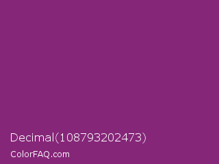 Decimal 108793202473 Color is a normal magenta color and the nearest color is Razzmic Berry Crayola #843179. Hex code #862679 and RGB value is rgb(134,38,121). In RGB color space, this color is composed of 53% red, 15% green, 47% blue, In CMYK color space, this color is composed of 0% cyan, 72% magenta, 10% yellow , 47% black , In HSL color space, this color has a hue angle of 308° , 56% saturation and 34% lightness.