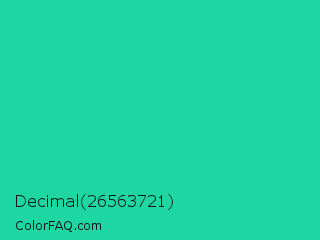 Decimal 26563721 Color is a normal green color and the nearest color is Shamrock #33cc99. Hex code #1dd6a1 and RGB value is rgb(29,214,161). In RGB color space, this color is composed of 11% red, 84% green, 63% blue, In CMYK color space, this color is composed of 86% cyan, 0% magenta, 25% yellow , 16% black , In HSL color space, this color has a hue angle of 163° , 76% saturation and 48% lightness.