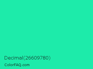 Decimal 26609780 Color is a normal green color and the nearest color is Medium Spring Green #00fa9a. Hex code #1debaa and RGB value is rgb(29,235,170). In RGB color space, this color is composed of 11% red, 92% green, 67% blue, In CMYK color space, this color is composed of 88% cyan, 0% magenta, 28% yellow , 8% black , In HSL color space, this color has a hue angle of 161° , 84% saturation and 52% lightness.