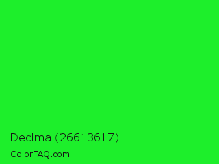 Decimal 26613617 Color is a normal green color and the nearest color is Neon Green #39ff14. Hex code #1def2b and RGB value is rgb(29,239,43). In RGB color space, this color is composed of 11% red, 94% green, 17% blue, In CMYK color space, this color is composed of 88% cyan, 0% magenta, 82% yellow , 6% black , In HSL color space, this color has a hue angle of 124° , 87% saturation and 53% lightness.