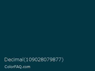 Decimal 109028079877 Color is a very dark cyan color and the nearest color is Cyprus #003e40. Hex code #003541 and RGB value is rgb(0,53,65). In RGB color space, this color is composed of 0% red, 21% green, 25% blue, In CMYK color space, this color is composed of 100% cyan, 18% magenta, 0% yellow , 75% black , In HSL color space, this color has a hue angle of 191° , 100% saturation and 13% lightness.