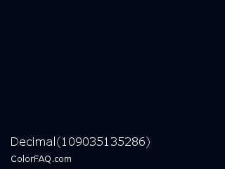 Decimal 109035135286 Color is a almost black blue color and the nearest color is Blue Charcoal #010d1a. Hex code #010918 and RGB value is rgb(1,9,24). In RGB color space, this color is composed of 0% red, 4% green, 9% blue, In CMYK color space, this color is composed of 96% cyan, 63% magenta, 0% yellow , 91% black , In HSL color space, this color has a hue angle of 219° , 92% saturation and 5% lightness.