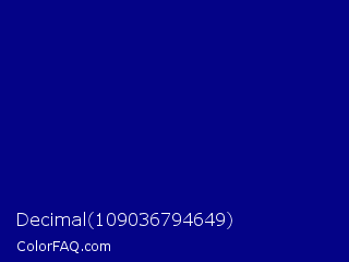Decimal 109036794649 Color is a dark blue color and the nearest color is Dark Blue #00008b. Hex code #040387 and RGB value is rgb(4,3,135). In RGB color space, this color is composed of 2% red, 1% green, 53% blue, In CMYK color space, this color is composed of 97% cyan, 98% magenta, 0% yellow , 47% black , In HSL color space, this color has a hue angle of 240° , 96% saturation and 27% lightness.