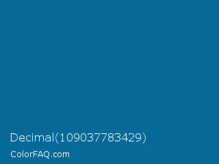 Decimal 109037783429 Color is a normal blue color and the nearest color is Sea Blue #006994. Hex code #056999 and RGB value is rgb(5,105,153). In RGB color space, this color is composed of 2% red, 41% green, 60% blue, In CMYK color space, this color is composed of 97% cyan, 31% magenta, 0% yellow , 40% black , In HSL color space, this color has a hue angle of 199° , 94% saturation and 31% lightness.
