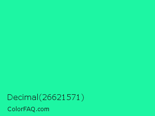 Decimal 26621571 Color is a normal green color and the nearest color is Medium Spring Green #00fa9a. Hex code #1df6a3 and RGB value is rgb(29,246,163). In RGB color space, this color is composed of 11% red, 96% green, 64% blue, In CMYK color space, this color is composed of 88% cyan, 0% magenta, 34% yellow , 4% black , In HSL color space, this color has a hue angle of 157° , 92% saturation and 54% lightness.