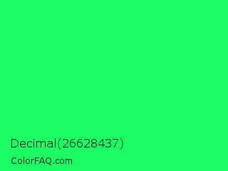 Decimal 26628437 Color is a normal green color and the nearest color is Spring Green #00ff7f. Hex code #1dfc63 and RGB value is rgb(29,252,99). In RGB color space, this color is composed of 11% red, 99% green, 39% blue, In CMYK color space, this color is composed of 88% cyan, 0% magenta, 61% yellow , 1% black , In HSL color space, this color has a hue angle of 139° , 97% saturation and 55% lightness.