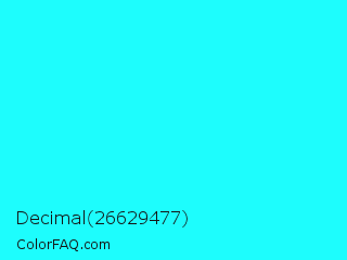 Decimal 26629477 Color is a normal cyan color and the nearest color is Loeen #15f2fd. Hex code #1dfdfd and RGB value is rgb(29,253,253). In RGB color space, this color is composed of 11% red, 99% green, 99% blue, In CMYK color space, this color is composed of 89% cyan, 0% magenta, 0% yellow , 1% black , In HSL color space, this color has a hue angle of 180° , 98% saturation and 55% lightness.