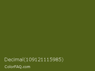 Decimal 109121115985 Color is a dark lime color and the nearest color is Saratoga #555b10. Hex code #506017 and RGB value is rgb(80,96,23). In RGB color space, this color is composed of 31% red, 38% green, 9% blue, In CMYK color space, this color is composed of 17% cyan, 0% magenta, 76% yellow , 62% black , In HSL color space, this color has a hue angle of 73° , 61% saturation and 23% lightness.