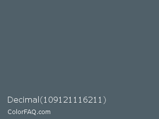 Decimal 109121116211 Color is a normal blue color and the nearest color is Stormcloud #4f666a. Hex code #506069 and RGB value is rgb(80,96,105). In RGB color space, this color is composed of 31% red, 38% green, 41% blue, In CMYK color space, this color is composed of 24% cyan, 9% magenta, 0% yellow , 59% black , In HSL color space, this color has a hue angle of 202° , 14% saturation and 36% lightness.