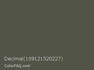 Decimal 109121520227 Color is a dark lime color and the nearest color is Fuscous Gray #54534d. Hex code #515447 and RGB value is rgb(81,84,71). In RGB color space, this color is composed of 32% red, 33% green, 28% blue, In CMYK color space, this color is composed of 4% cyan, 0% magenta, 15% yellow , 67% black , In HSL color space, this color has a hue angle of 74° , 8% saturation and 30% lightness.