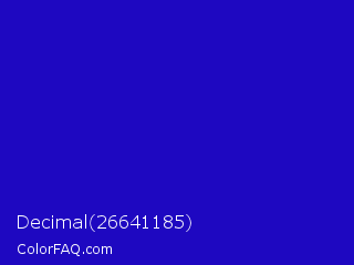 Decimal 26641185 Color is a normal indigo color and the nearest color is Interdimensional Blue #360ccc. Hex code #1e08c1 and RGB value is rgb(30,8,193). In RGB color space, this color is composed of 12% red, 3% green, 76% blue, In CMYK color space, this color is composed of 84% cyan, 96% magenta, 0% yellow , 24% black , In HSL color space, this color has a hue angle of 247° , 92% saturation and 39% lightness.