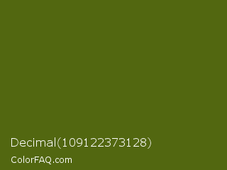 Decimal 109122373128 Color is a dark lime color and the nearest color is Saratoga #555b10. Hex code #526710 and RGB value is rgb(82,103,16). In RGB color space, this color is composed of 32% red, 40% green, 6% blue, In CMYK color space, this color is composed of 20% cyan, 0% magenta, 84% yellow , 60% black , In HSL color space, this color has a hue angle of 74° , 73% saturation and 23% lightness.