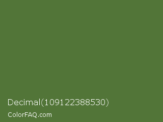 Decimal 109122388530 Color is a normal green color and the nearest color is Chalet Green #516e3d. Hex code #527538 and RGB value is rgb(82,117,56). In RGB color space, this color is composed of 32% red, 46% green, 22% blue, In CMYK color space, this color is composed of 30% cyan, 0% magenta, 52% yellow , 54% black , In HSL color space, this color has a hue angle of 94° , 35% saturation and 34% lightness.