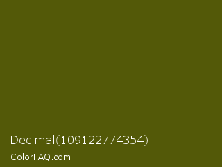 Decimal 109122774354 Color is a very dark yellow color and the nearest color is Saratoga #555b10. Hex code #535908 and RGB value is rgb(83,89,8). In RGB color space, this color is composed of 33% red, 35% green, 3% blue, In CMYK color space, this color is composed of 7% cyan, 0% magenta, 91% yellow , 65% black , In HSL color space, this color has a hue angle of 64° , 84% saturation and 19% lightness.