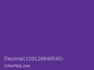 Decimal 109126849545 Color is a normal violet color and the nearest color is Blue Magenta Violet #553592. Hex code #593091 and RGB value is rgb(89,48,145). In RGB color space, this color is composed of 35% red, 19% green, 57% blue, In CMYK color space, this color is composed of 39% cyan, 67% magenta, 0% yellow , 43% black , In HSL color space, this color has a hue angle of 265° , 50% saturation and 38% lightness.