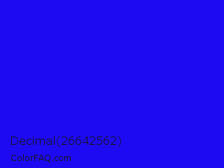 Decimal 26642562 Color is a normal indigo color and the nearest color is Bluebonnet #1c1cf0. Hex code #1e0af2 and RGB value is rgb(30,10,242). In RGB color space, this color is composed of 12% red, 4% green, 95% blue, In CMYK color space, this color is composed of 88% cyan, 96% magenta, 0% yellow , 5% black , In HSL color space, this color has a hue angle of 245° , 92% saturation and 49% lightness.