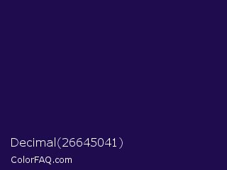 Decimal 26645041 Color is a very dark indigo color and the nearest color is Tolopea #1b0245. Hex code #1e0c4f and RGB value is rgb(30,12,79). In RGB color space, this color is composed of 12% red, 5% green, 31% blue, In CMYK color space, this color is composed of 62% cyan, 85% magenta, 0% yellow , 69% black , In HSL color space, this color has a hue angle of 256° , 74% saturation and 18% lightness.