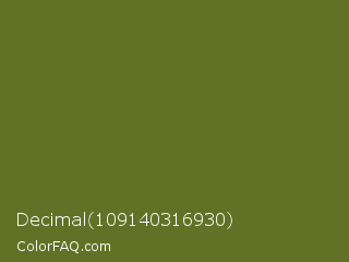 Decimal 109140316930 Color is a dark lime color and the nearest color is Fern Frond #657220. Hex code #637126 and RGB value is rgb(99,113,38). In RGB color space, this color is composed of 39% red, 44% green, 15% blue, In CMYK color space, this color is composed of 12% cyan, 0% magenta, 66% yellow , 56% black , In HSL color space, this color has a hue angle of 71° , 50% saturation and 30% lightness.