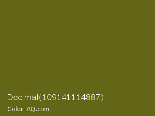 Decimal 109141114887 Color is a dark yellow color and the nearest color is Himalaya #6a5d1b. Hex code #646617 and RGB value is rgb(100,102,23). In RGB color space, this color is composed of 39% red, 40% green, 9% blue, In CMYK color space, this color is composed of 2% cyan, 0% magenta, 77% yellow , 60% black , In HSL color space, this color has a hue angle of 62° , 63% saturation and 25% lightness.