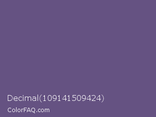 Decimal 109141509424 Color is a normal violet color and the nearest color is Dolphin #646077. Hex code #655282 and RGB value is rgb(101,82,130). In RGB color space, this color is composed of 40% red, 32% green, 51% blue, In CMYK color space, this color is composed of 22% cyan, 37% magenta, 0% yellow , 49% black , In HSL color space, this color has a hue angle of 264° , 23% saturation and 42% lightness.