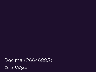 Decimal 26646885 Color is a very dark violet color and the nearest color is Haiti #1b1035. Hex code #1e0f2d and RGB value is rgb(30,15,45). In RGB color space, this color is composed of 12% red, 6% green, 18% blue, In CMYK color space, this color is composed of 33% cyan, 67% magenta, 0% yellow , 82% black , In HSL color space, this color has a hue angle of 270° , 50% saturation and 12% lightness.