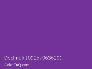 Decimal 109257963620 Color is a normal purple color and the nearest color is Purple Heart #69359c. Hex code #733298 and RGB value is rgb(115,50,152). In RGB color space, this color is composed of 45% red, 20% green, 60% blue, In CMYK color space, this color is composed of 24% cyan, 67% magenta, 0% yellow , 40% black , In HSL color space, this color has a hue angle of 278° , 50% saturation and 40% lightness.