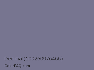 Decimal 109260976466 Color is a normal indigo color and the nearest color is Rhythm #777696. Hex code #777590 and RGB value is rgb(119,117,144). In RGB color space, this color is composed of 47% red, 46% green, 56% blue, In CMYK color space, this color is composed of 17% cyan, 19% magenta, 0% yellow , 44% black , In HSL color space, this color has a hue angle of 244° , 11% saturation and 51% lightness.