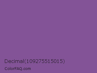 Decimal 109275515015 Color is a normal purple color and the nearest color is French Lilac #86608e. Hex code #835397 and RGB value is rgb(131,83,151). In RGB color space, this color is composed of 51% red, 33% green, 59% blue, In CMYK color space, this color is composed of 13% cyan, 45% magenta, 0% yellow , 41% black , In HSL color space, this color has a hue angle of 282° , 29% saturation and 46% lightness.