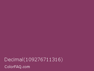 Decimal 109276711316 Color is a normal magenta color and the nearest color is Boysenberry #873260. Hex code #853862 and RGB value is rgb(133,56,98). In RGB color space, this color is composed of 52% red, 22% green, 38% blue, In CMYK color space, this color is composed of 0% cyan, 58% magenta, 26% yellow , 48% black , In HSL color space, this color has a hue angle of 327° , 41% saturation and 37% lightness.