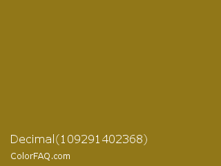 Decimal 109291402368 Color is a normal yellow color and the nearest color is Sand Dune #967117. Hex code #917718 and RGB value is rgb(145,119,24). In RGB color space, this color is composed of 57% red, 47% green, 9% blue, In CMYK color space, this color is composed of 0% cyan, 18% magenta, 83% yellow , 43% black , In HSL color space, this color has a hue angle of 47° , 72% saturation and 33% lightness.