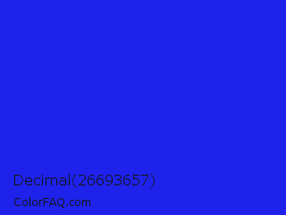 Decimal 26693657 Color is a normal blue color and the nearest color is Bluebonnet #1c1cf0. Hex code #1e22eb and RGB value is rgb(30,34,235). In RGB color space, this color is composed of 12% red, 13% green, 92% blue, In CMYK color space, this color is composed of 87% cyan, 86% magenta, 0% yellow , 8% black , In HSL color space, this color has a hue angle of 239° , 84% saturation and 52% lightness.