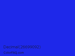 Decimal 26699092 Color is a normal blue color and the nearest color is Bluebonnet #1c1cf0. Hex code #1e28ea and RGB value is rgb(30,40,234). In RGB color space, this color is composed of 12% red, 16% green, 92% blue, In CMYK color space, this color is composed of 87% cyan, 83% magenta, 0% yellow , 8% black , In HSL color space, this color has a hue angle of 237° , 83% saturation and 52% lightness.